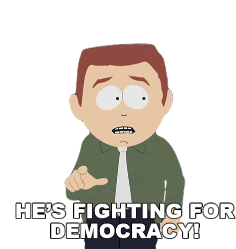 Stephen Stotch from South Park passionately declares "He's Fighting For Democracy!" with an earnest expression.