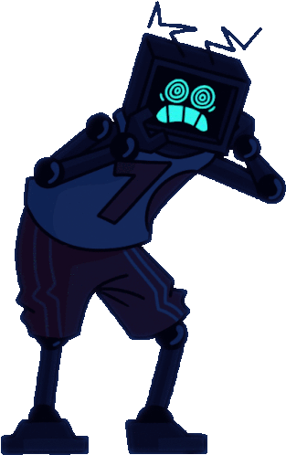 The animated character Hex Virus, with a monitor head and number 7 shirt, strikes a dynamic pose.