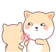 A cute cartoon dog holds a fly swatter, looking mischievous, while a smaller dog watches, implying a playful slap or punishment.
