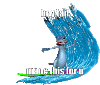 An animated lizard character, 'Hey Tad', surfs a blue wave with the message 'made this for u' on a green board.