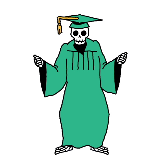 Heytvm graduation sticker featuring a skeleton in a green gown and cap, shrugging with open hands.