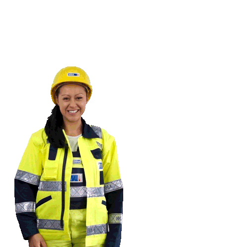 A happy woman in a hard hat and high-visibility jacket cheers excitedly, pumping her fists, then triumphantly throws her helmet.