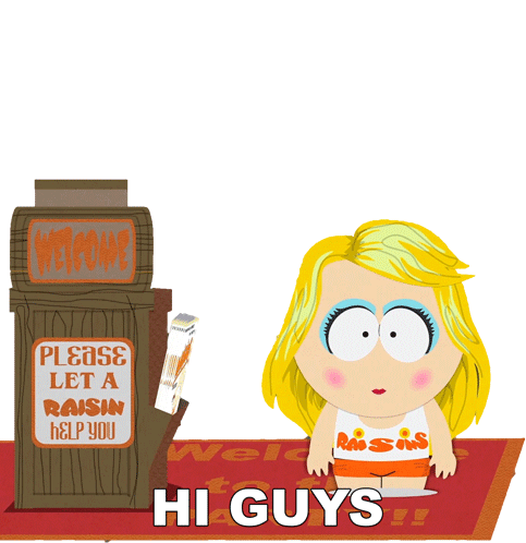 Mercedes, a Raisins girl from South Park, waves and greets with 'Hi Guys' next to a welcome stand.