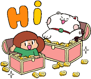 A cute girl and a happy cat pop out of treasure chests filled with gold, waving "Hi" with a cheerful surprise.
