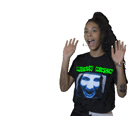 Rico Nasty waves hello with an excited, open-mouthed smile, wearing a Marilyn Manson t-shirt.