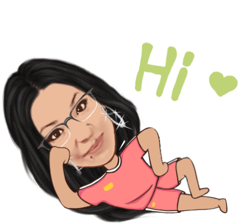 A relaxed avatar with black hair, glasses, and sparkly earrings smiles while lying down, saying 'Hi Hello There'.