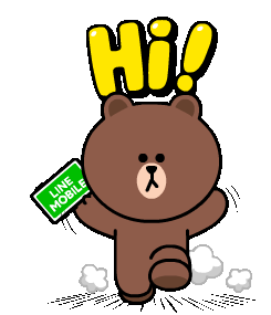 LINE Friends character Brown the bear runs happily, greeting with "Hi!" and holding a "LINE MOBILE" sign.