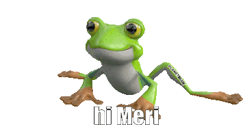 A friendly green frog with big eyes smiles and waves, saying 'Hi Meri'.