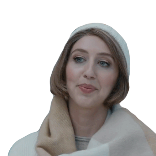 Heidi Gardner, wearing a white beanie and scarf, waves hello with a friendly expression, perfect for a Saturday Night Live greeting.