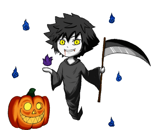 A cute chibi vampire grim reaper with a scythe, surrounded by blue flames and a glowing jack-o'-lantern for Halloween.