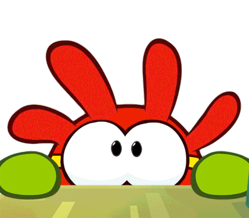 Super Noms, the character Om Nom, playfully hides and then pops up with a wide, toothy grin.