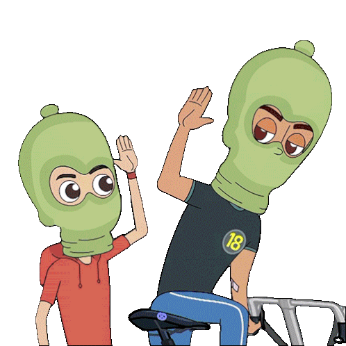 Chikoo and Bunty celebrate with an enthusiastic high five, showing teamwork and success.
