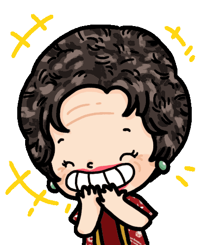 Bu Yusni laughing heartily with a wide smile and sparkling joy. A cheerful and happy sticker from Bisa Group.