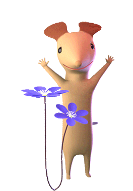 Hiiruthemouse, a cute 3D animated mouse, waves hello while holding two purple flowers, expressing happiness.