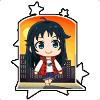 Hikaru Nanjo, a cheerful chibi character, walks confidently against a city sunset backdrop.