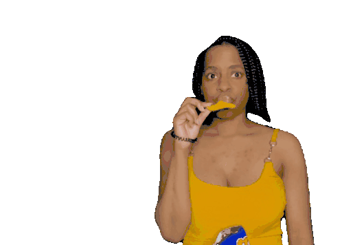 Hillynne Milajanson eats a tortilla chip, showing a moment of surprise or contemplation after the bite.
