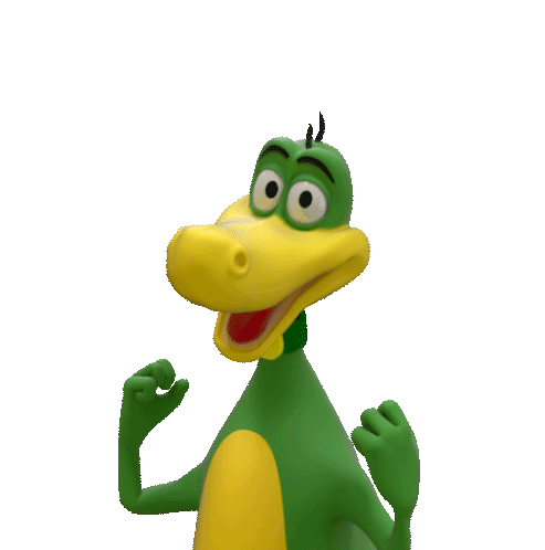 The cheerful Hiperdino Superdino mascot, a green and yellow dinosaur, greets with outstretched arms and an open mouth.
