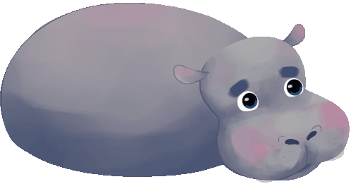 A charming, plump cartoon hippo lies down and blinks its big, expressive eyes, showcasing its adorable nature.