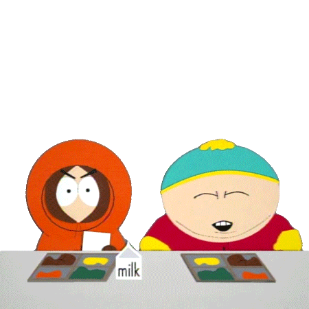 Kenny McCormick whispers to Eric Cartman, who reacts with a sudden, annoyed expression at the lunch table.
