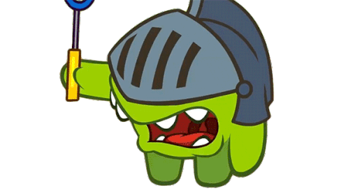 Om Nom, wearing a knight's helmet, gets hit in the face by a bowling pin, showing a surprised and pained expression.
