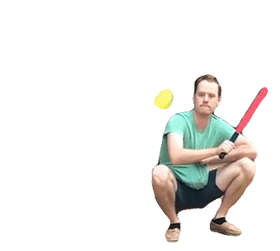 Man in green shirt squats, attempting to hit a yellow ball with a red bat, resulting in an epic fail and a pained reaction.