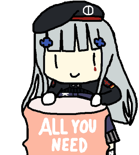 Hk416, a cute anime girl, holds a sign that reads 'ALL YOU NEED', with a subtle bounce animation.