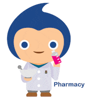 Friendly HKUMed pharmacy mascot in a lab coat, holding a mortar and pestle and a bottle of pink medicine.