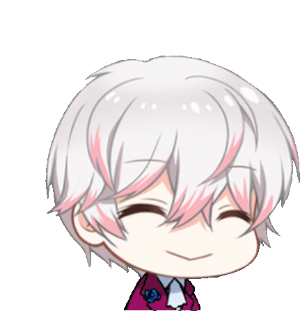 A cute chibi anime boy with white hair and pink streaks smiles happily, his eyes closed in a joyful expression. A charming animated sticker.