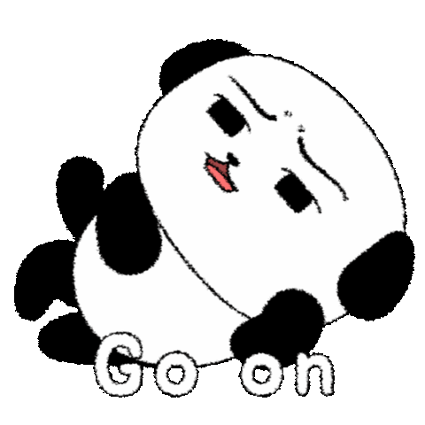 A skeptical panda character with a raised eyebrow and a slight smirk, lying down and saying "Go on."