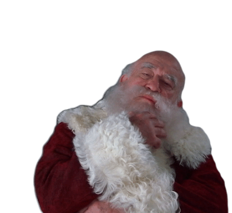 Santa Claus in his red suit and white beard, looking thoughtful and stroking his beard, pondering a decision.