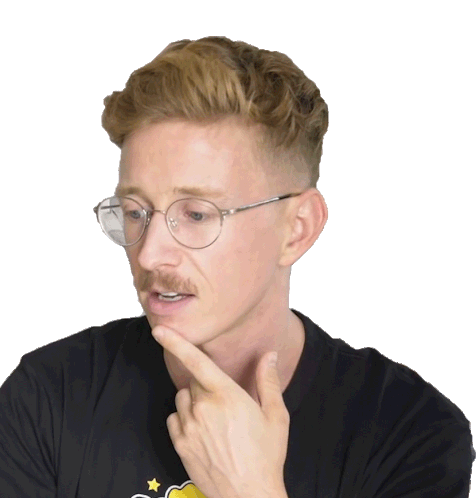 Tyler Oakley in a thoughtful moment, finger on chin, contemplating with a slight smile. A funny and expressive reaction.