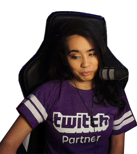 Katherine Conti in her Twitch Partner shirt, looking thoughtful and wondering, with a 'hmmm' expression.