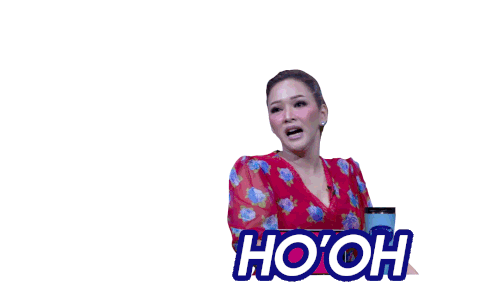 Maia Estianty, a judge on Indonesian Idol, expresses delight with an enthusiastic "Ho Oh" while wearing a vibrant red floral top.