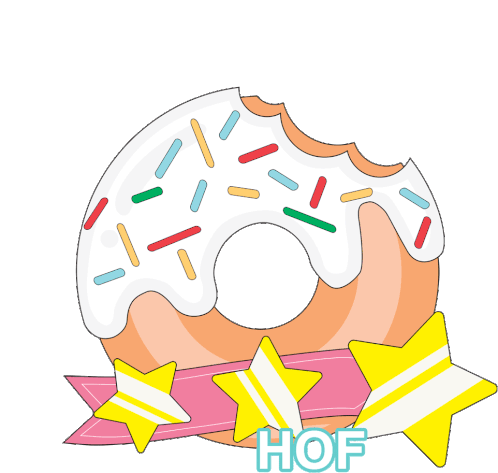 A delicious animated donut with white icing, colorful sprinkles, and a bite taken out. Features three yellow stars and a pink ribbon with 'HOF' for Hof Hofvii.