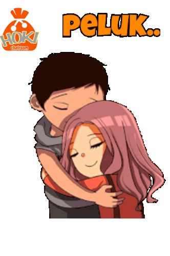 A sweet Hokiroom Miggi sticker showing a man hugging a woman with the text 'Peluk Sini' (Hug Here).