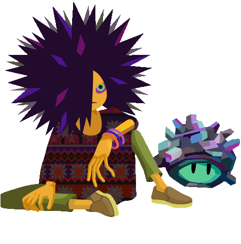 Hokonerd, a spiky purple character, sits with a questioning expression, accompanied by a smaller creature, conveying a waiting mood.