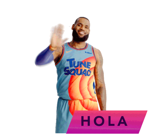 LeBron James in his Tune Squad jersey waves hello with a friendly smile, featuring the Spanish greeting 'Hola'.