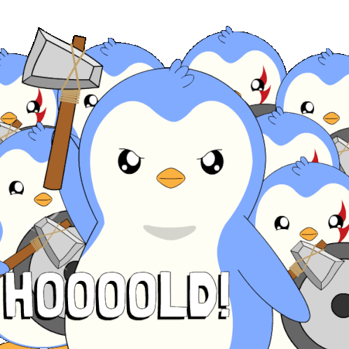 a group of penguins are holding hammers and the word hooooold is on the bottom