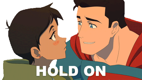 Clark Kent and Lois Lane share a tender moment with the caption 'Hold On' in this animated sticker from My Adventures with Superman.