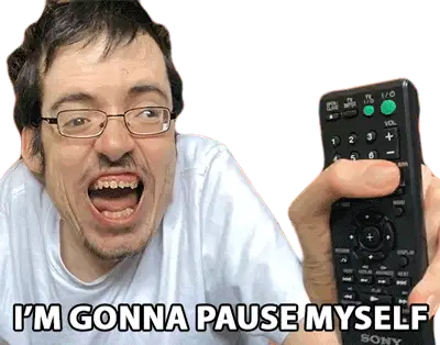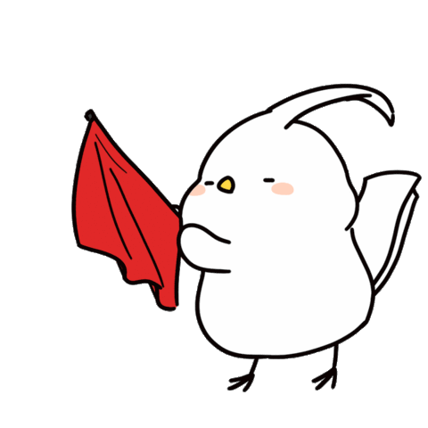 An adorable white bird-like creature playfully waves a red cloth, signaling to 'hold on' or 'pause' in a charming matador style.