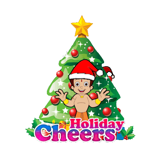 Chhota Bheem, Santa, and a snowman celebrate the holidays with a festive Christmas tree and 'Holiday Cheers' text.