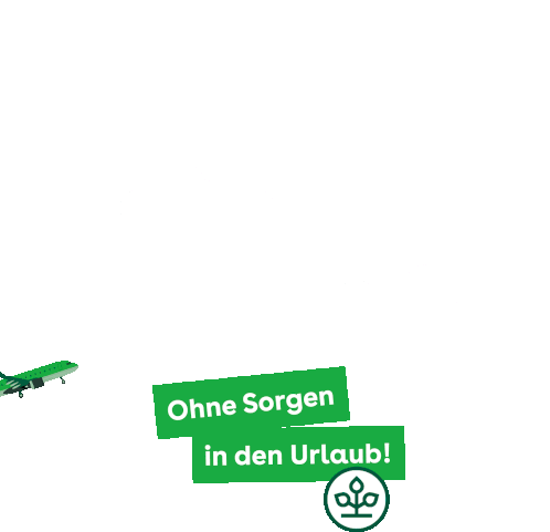 A green airplane takes off, accompanied by the German phrase "Ohne Sorgen in den Urlaub!" and a health insurance logo.