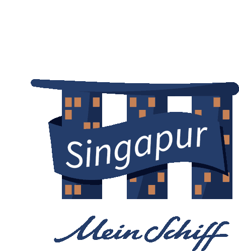 A stylized depiction of Singapore's iconic skyline with a 'Mein Schiff' cruise banner, perfect for holiday and travel themes.