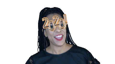 Holly Logan celebrates the New Year, wearing festive '2020!' glasses and smiling brightly, spreading cheer.