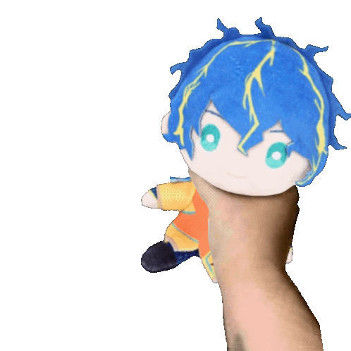 Holostars' Astel Leda animated sticker shows the character shaking a stuffed animal with blue hair and green eyes.