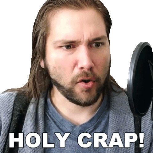 Michael Kupris reacts with a surprised expression, accompanied by the text 'HOLY CRAP!' and a microphone.