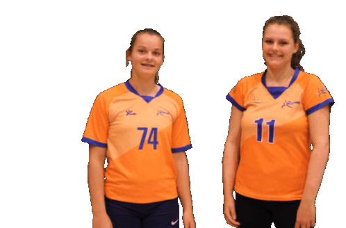Debbie and Sanne, two volleyball players from Belfeld, share a warm hug, smiling brightly in their team uniforms.