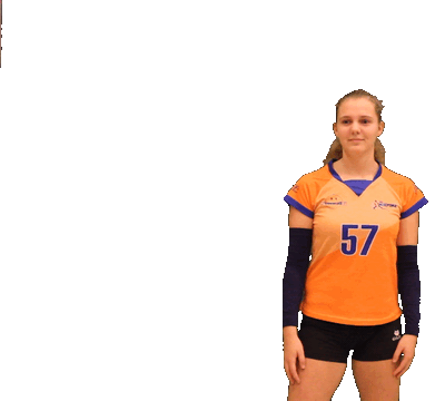 Aranka, a player from Holyoke Belfeld Dames 3, performs a focused volleyball pass in her orange and blue uniform.