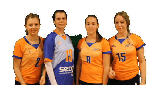 The Holyoke Belfeld volleyball team, including Maud, Sanne, Shenna, and Vivian, cheers enthusiastically.