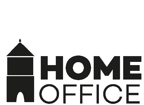 A black and white animated logo featuring a stylized house icon next to the bold text 'HOME OFFICE'.